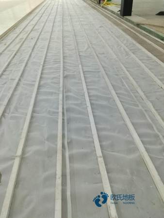 十一、铺放防潮膜:将体育木地板专用防潮膜按面板铺设方向进行铺展,接缝应避免重叠,接缝应用压敏胶带粘连。